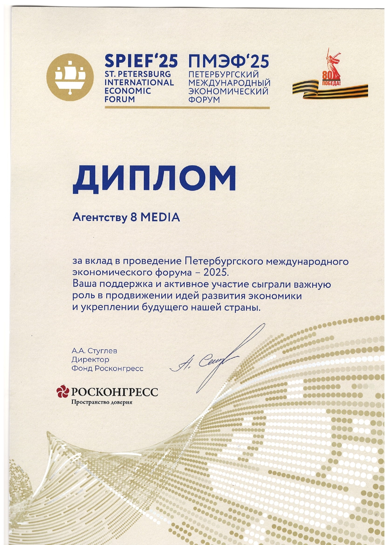 Медиахолдинг «8Медиа» получил диплом за вклад в проведение Петербургского международного экономического форума – 2025