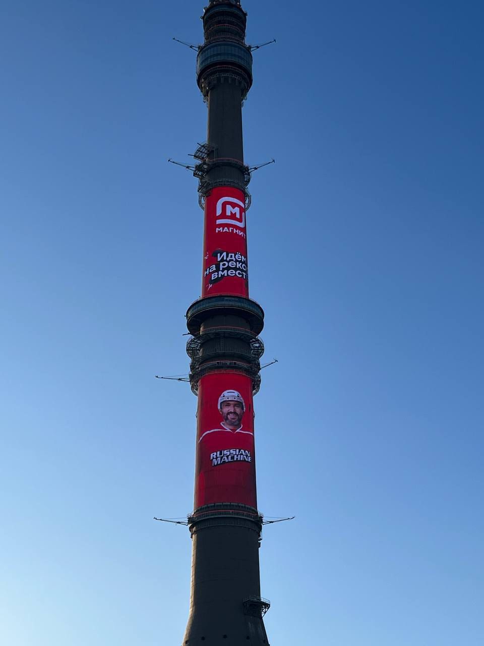 В дни охоты за историческим рекордом «Магнит» вывел на медиафасад Останкинской телебашни ролик поддержки Александра Овечкина — запуск прошёл через медиахолдинг 8MEDIA.На красной вертикали — слоган «Идём на рекорд вместе», ниже крупный портрет Овечкина с подписью RUSSIAN MACHINE: лаконичная графика считывается с городской дистанции.